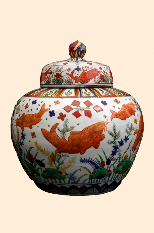 De wijnkruik voor banketten aan het keizerlijke hof is een pareltje uit de keizerlijke ateliers. Let op de omvang en de versiering van de kruik, een voorbeeld van de grote innovaties van die tijd: de decoratieve wucai-techniek (met vijf kleuren). Dit is een uitzonderlijk zeldzaam voorwerp in het westen.